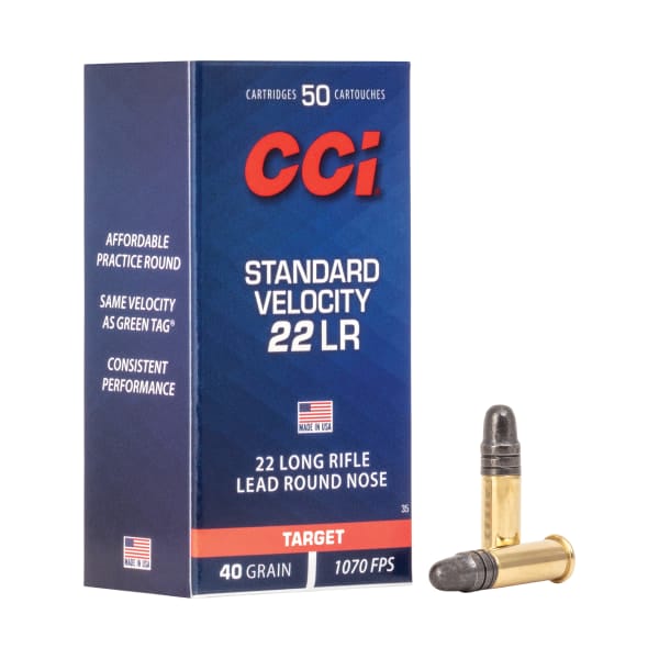 CCI Standard Velocity .22 LR 40 Grain Lead Round Nose Rimfire Rimfire Ammo shoots at the same velocity as their premier match rimfire cartridges to obtain maximum accuracy potential. CCI’s tight quality control during manufacturing eliminates any variables that cause inconsistencies, resulting in highly reliable ammunition, with excellent accuracy. Producing minimal noise and muzzle blast at sub-sonic velocities, makes CCI Standard Velocity Rimfire Ammo an ideal choice for plinking, target practice, general all-round use, and small game hunting with minimal meat damage. 40-grain, lead bullet Minimal noise and muzzle blast Highly reliable ammunition Sub-sonic velocities Excellent accuracy